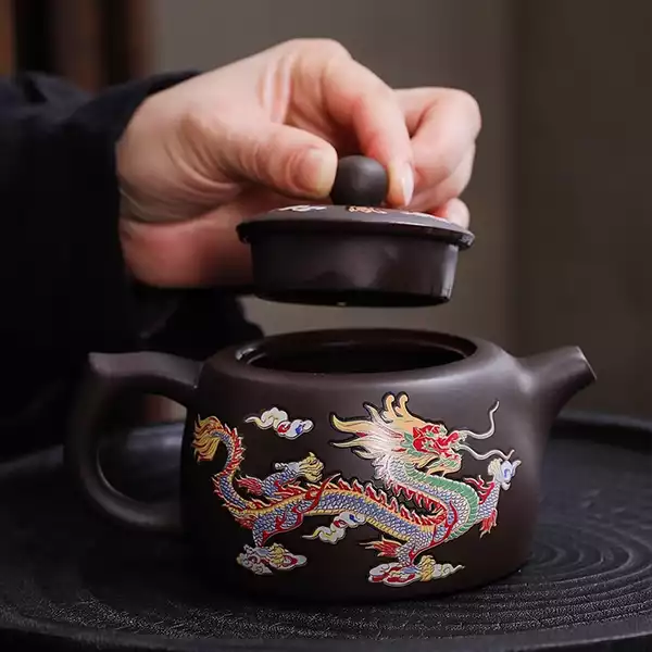 Cả mặt trước và mặt sau của ấm trà đều có họa tiết rồng và phượng, rồng bay và phượng múa sống động như thật. Sự xuất hiện của hai con vật này sẽ mang lại ý nghĩa của những điều tốt lành và may mắn